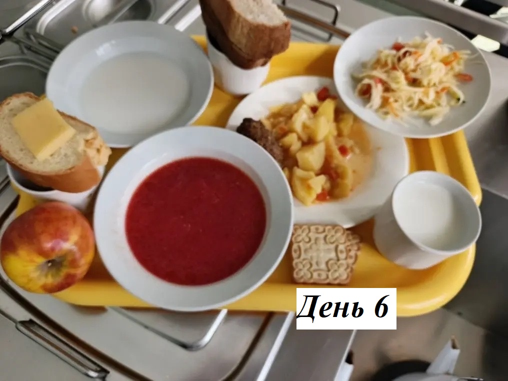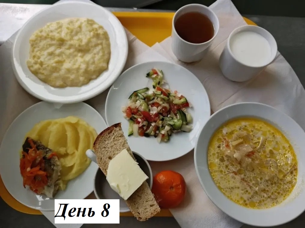 Рацион питания включает разнообразный ассортимент продуктов. Ежедневно в рационе питания используются мясные или рыбные блюда, молоко и кисломолочные продукты, сливочное и растительное масло, сыр, свежие овощи и фрукты, соки, крупы, хлеб, выпечка или кондитерские изделия.